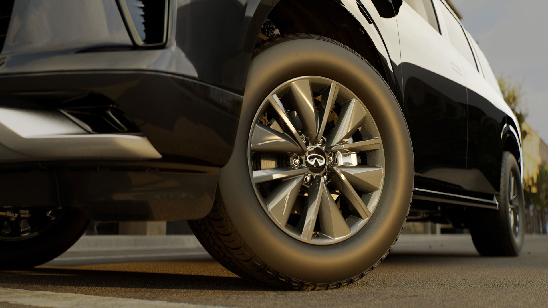 QX80’s available Electronic Air Suspension is a first for an INFINITI vehicle: lowering for easy interior access and raising for increased ground clearance to deliver plush, yet responsive handling.